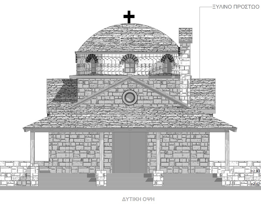 Μελέτη διαμόρφωσης των όψεων και επικαλύψεων στον ανεγειρόμενο Ι.Ναό Οσίου Παϊσίου στη Μακρακώμη Φθιώτιδας, καθώς και εργασίες λίθινης επένδυσης, κατασκευής προστώου και επικάλυψης στεγών με πλάκες.