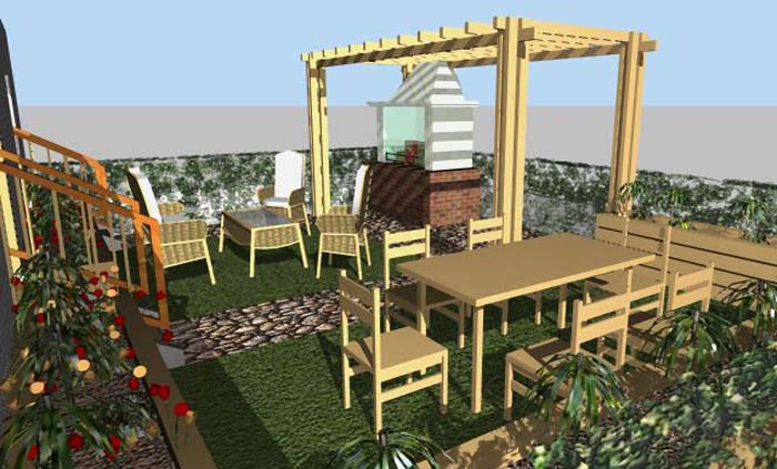 Και στις δύο προτάσεις υπάρχει ένα μεγάλο μέρος της αυλής σκεπασμένο με πέργκολα που συμπεριλαμβάνει το barbeque και χώρο για εστίαση, ενώ υπάρχει χώρος και για σαλονάκι εξωτερικού χώρου. Το έδαφος είναι διαμορφωμένο με πλακόστρωτο που κατά τμήματα αφήνει τη θέση του σε χλοοτάπητα ή τριφύλλι.