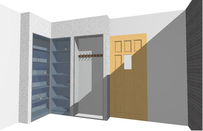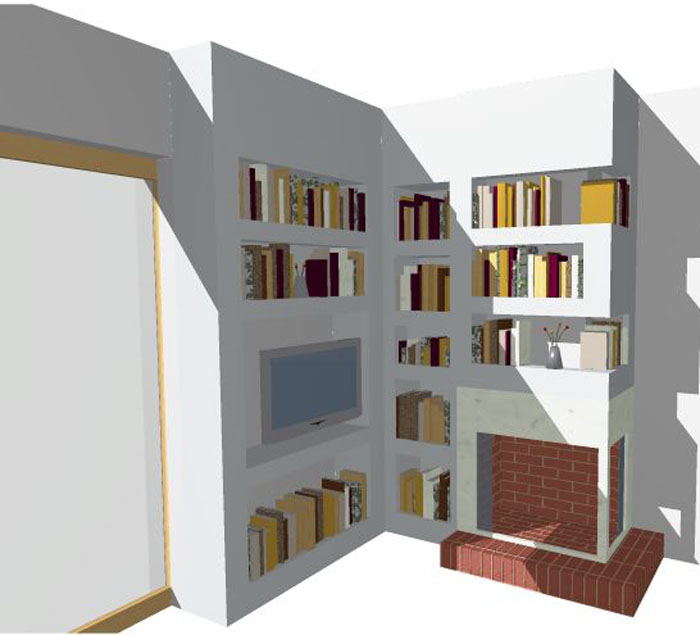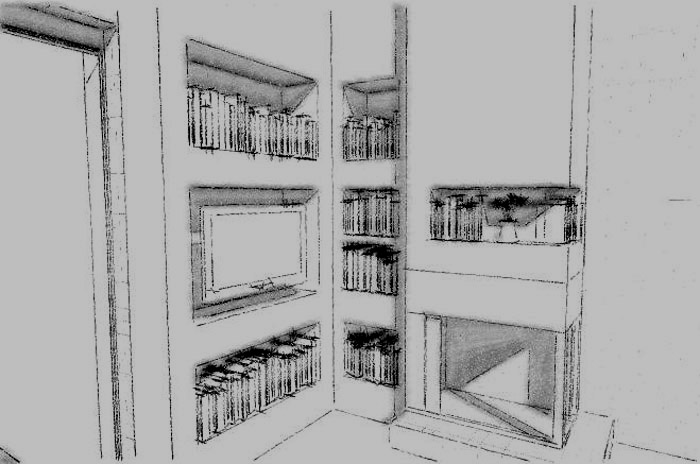 Στον περιορισμένο χώρο του καθιστικού ενός διαμερίσματος οι κατασκευές από γυψοσανίδα σπάνε τη μονοτονία καθώς δημιουργούν ράφια για βιβλία και διακοσμητικά στοιχεία, χώρο για την τηλεόραση, βιτρίνες, καθώς και μια μικρή ιματιοθήκη δίπλα στην πόρτα ώστε τα παλτά και οι ομπρέλες να είναι αποθηκευμένα και να μη δίνουν την αίσθηση ακαταστασίας.