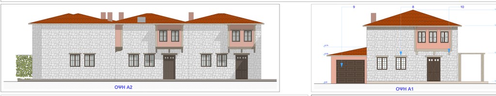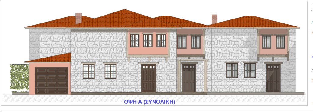 Η γκαραζόπορτα θα είναι μεταλλική χρώματος καφέ όπως τα ξύλινα κουφώματα (RAL 8003). Η στέγη ακολουθεί τα πρότυπα του κυρίως κτιρίου.