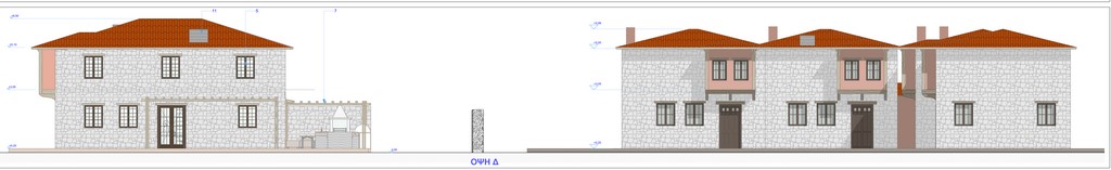 Το χρώμα που θα χρησιμοποιηθεί είναι το λεγόμενο "κορασάνι" (αντιστοιχία σε RAL 3015), το οποίο θα χρησιμοποιηθεί και στους αρμούς της λιθοδομής. Τα κουφώματα θα είναι ξύλινα χρώματος καφέ (RAL 8003), με καϊτια, ενώ δε θα φέρουν εξωτερικά "σκούρα" (πατζούρια). Όλα τα υπέρθυρα των κουφωμάτων είναι ξύλινα. Όλα τα παράθυρα θα φέρουν μεταλλικά προστατευτικά κιγκλιδώματα ασφαλείας χρώματος μαύρου.