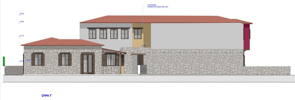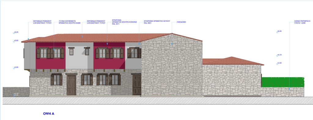 Το κύριο σώμα του ορόφου θα είναι επιχρισμένο χρώματος λευκού (RAL 9001), το επίχρισμα των έρκερ θα είναι βαθύ κόκκινο (RAL 3011), ένα χρώμα που απαντάται στον οικισμό του Καστρακίου (όπως παράδειγμα οι διατηρητέες οικία Σωτηρίου και οικία Μάγγου στο Μεσοχώρι Καστρακίου). Στη βόρεια όψη του ορόφου υπάρχει εσοχή στο χρώμα της ώχρας, προκειμένου να τοποθετηθεί λέβητας φυσικού αερίου και εξωτερική μονάδα κλιματισμού για τις ανάγκες ψύξης, θέρμανσης και παραγωγής ζεστού νερού. Προκειμένου να ικανοποιηθούν οι ανάγκες ψύξης, θέρμανσης και παραγωγής ζεστού νερού, θα τοποθετηθούν αντλίες θερμότητας σε ειδικά διαμορφωμένα κουβούκλια κατά μήκος της περίφραξης όπως φαίνεται στα σχέδια προκειμένου να μην είναι ορατές .