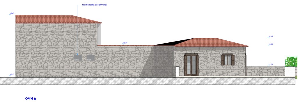 Η προσθήκη κατ’ επέκταση θα πραγματοποιηθεί επίσης με λιθοδομή από πέτρα της περιοχής όμοια με τα υφιστάμενα κτίρια, των οποίων η λιθοδομή θα ενισχυθεί θα καθαριστεί και θα αρμολογηθεί ώστε να παραμείνει εμφανής. Το χρώμα των αρμών θα αποφασιστεί σε συνεργασία με την αρμόδια εφορεία αρχαιοτήτων.