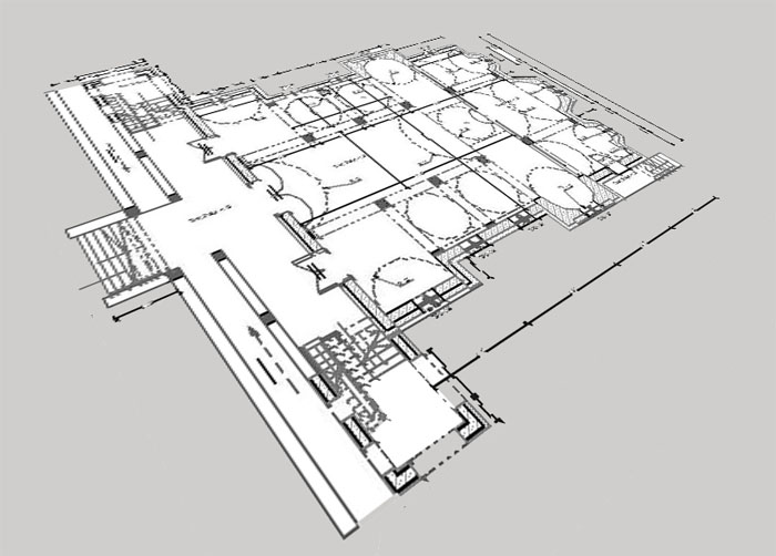 Στην κάτοψη τό εγκαρσιο κλίτος σχηματίζει ημικυκλικούς χορούς που στην απολήξή τους στέφονται με τεταρτοσφαίρια , στόν ίδιο τύπο που δημιουργείται η κεντρική αψίδα του Ιερού.